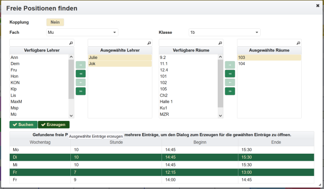 gewünschten Klasse (dem Lehrer oder Raum) gefragt. Sollte die